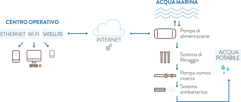 Gli impianti di dissalazione di Solaris Aquae, grazie all’osmosi inversa e ad un sistema integrato di disinfezione antibatterica, permettono di produrre acqua potabile in totale autonomia ed in qualunque sede geografica ci si trovi, risolvendo così i problemi legati alla scarsità idrica.